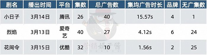 值得一提的还有《小日子》的商务情况。该剧仅一集无广,全剧共40个广告,4个合作品牌。在中小体量剧集范围而言,《小日子》能够做到近乎全剧有广,得益于明确自身定位后的招商策略。