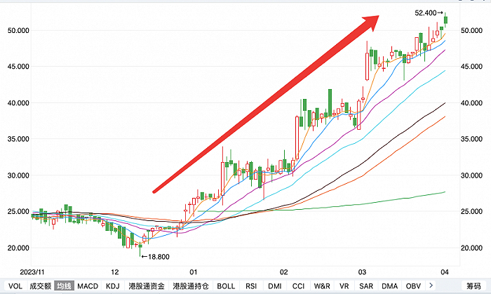 同样直线上升的还有上美股份的股价。4月2日上美股份盘中每股一度摸高到52.4港元,与去年12月18.8港元的低点相比翻了近两番。