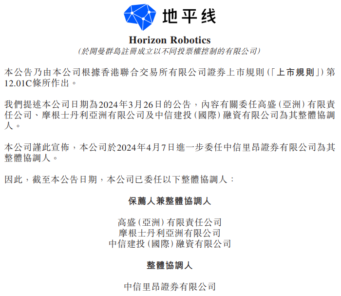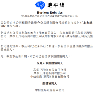 2024年4月8日,北京地平线机器人技术研发有限公司的控股公司Horizon Robotics(以下简称“地平线”)公告,于4月7日进一步委任中信里昂证券有限公司为其整体协调人。