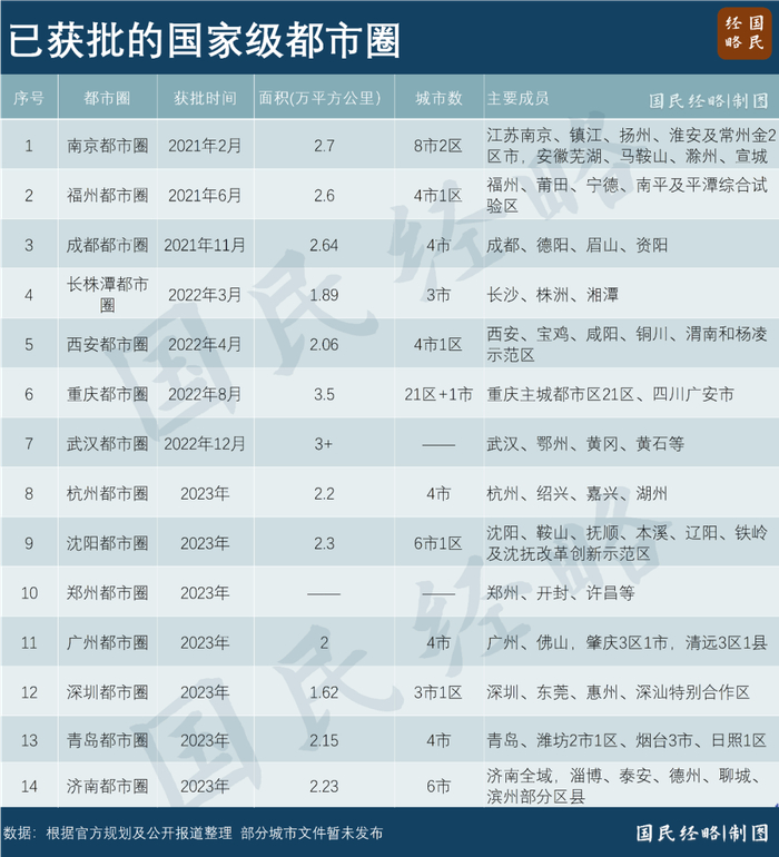 去年至今,新一批国家级都市圈诞生,包括广州、深圳、杭州、武汉、郑州、济南、青岛等超大特大城市。
