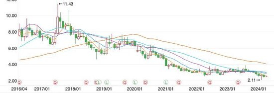 天茂集团这个保险概念股的股价,在2015年的确辉煌了一下:一度涨到16.97元每股的历史高位。但只可惜,随后便一路回落到10元以下,且长期维持在个位数的水准。截至2024年4月8日午盘,天茂集团的股价为2.48元每股,较最高时期缩水了85%。