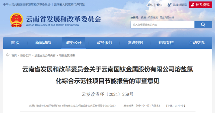 《楚雄州发展和改革委员会关于请求对云南国钛金属股份有限公司熔盐氯化综合示范性项目节能报告进行审查的请示》(楚发改资环〔2023〕253号)收悉。根据《中华人民共和国节约能源法》《固定资产投资项目节能审查办法》(国家发展改革委令2023年第2号)、《云南省发展和改革委员会关于加强固定资产投资项目节能审查工作的通知》(云发改资环〔2017〕299号)有关要求,省发展改革委委托云南省节能监察中心组织有关专家对该项目(项目代码:2210-532331-04-01-541558)节能报告进行了评审,对项目能源消费情况、能效水平、用能工艺及节能管理措施等提出如下意见: