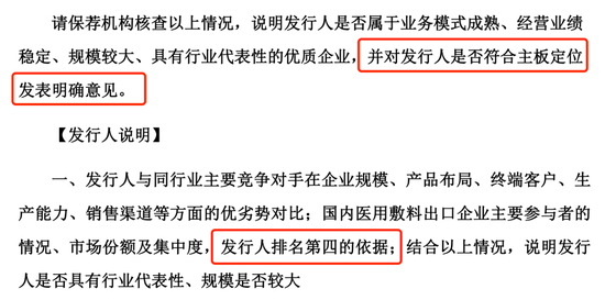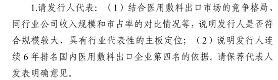 但是对于健尔康这一行业地位的真实性交易所始终持有怀疑。首轮问询中,要求其结合国内医用敷料出口企业主要参与者的情况、市场份额及集中度,说明排名第四的依据;上会阶段,依然要求保荐人对“发行人连续6年排名国内医用敷料出口企业第四名”的依据发表明确意见。