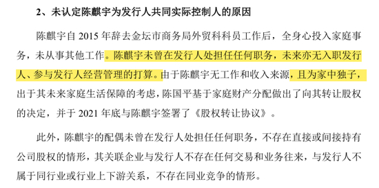 据披露,陈麒宇已全身心投入家庭事务,未从事其他工作。陈麒宇未曾在发行人处担任任何职务,未来亦无入职发行人、参与发行人经营管理的打算。换言之,陈国平的独女未来不会接班。