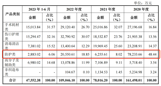 收入金额存在一定波动,主要产品的收入结构存在一定变化。2020年防护类产品为健尔康带来7.82亿元的收入,同比增长超82倍,占比达到48.44%。到了2021年,防护类产品的收入出现断崖式下跌,仅6255.61万元,2022年虽然回升至2.06亿元,但相较2020年依然下滑了73.73%。换言之,健尔康是借“口罩风口”大赚7亿元。