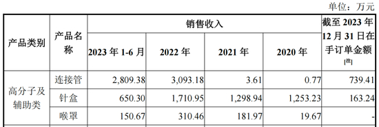 报告期内,随着开发出针盒、连接管、喉罩等新产品并实现销售,健尔康高分子及辅助类产品销售收入实现快速增长,分别为5718.40万元、7106.89万元、1.31亿元、6980.02万元,2020年-2022年复合增长率为51.23%。占主营业务收入的比例分别为3.54%、9.11%、11.99%、14.68%,成为新的增长动力。