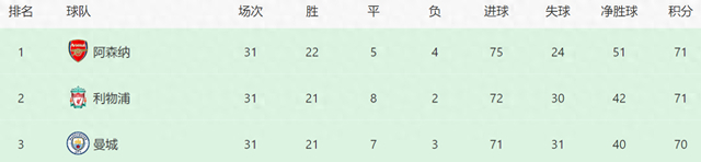 在北京时间今日凌晨结束的英超第32轮双红会中,利物浦2比2战平曼联。此役过后,争冠集团的三支球队一下子“挤”在了一起——阿森纳和利物浦同积71分,阿森纳净胜球领先暂时排名榜首,第三的曼城70分,以1分之差继续保持高压,英超的冠军争夺趋于白热化。