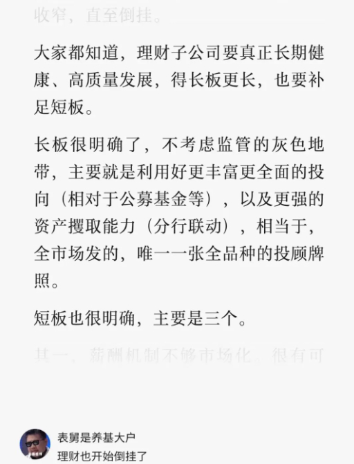 之前在《理财也开始倒挂了》里,表舅简单提了一下,银行理财子的三个长板,下图,一是监管的灰色地带,二是更强的资产攫取能力,三是更丰富更全面的投向,吊打公募基金。