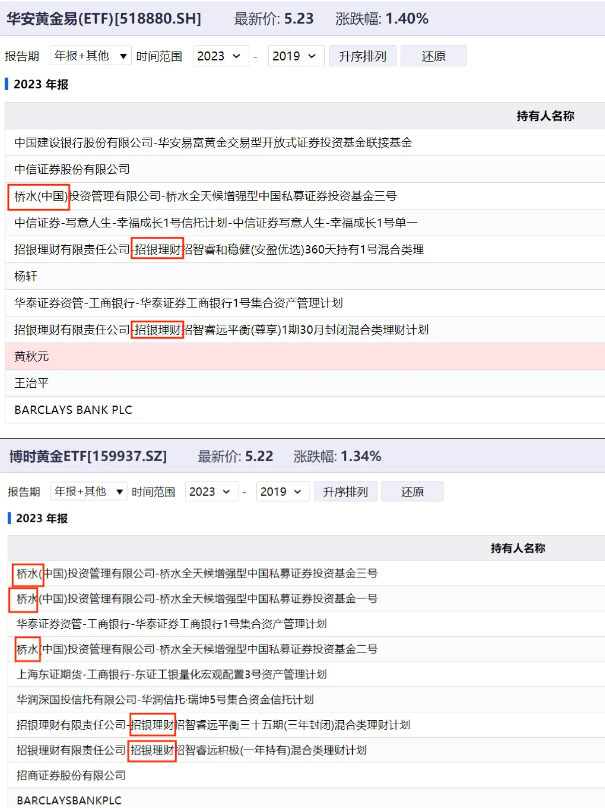 拿黄金ETF最多、最大的机构投资人,分别是达里奥的桥水基金,和国内的招银理财。