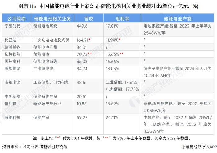 中国储能电池行业的上市公司中,宁德时代储能电池系统业务营收最高,为449.8亿元;派能科技储能产品毛利率最高,为34.11%;产能方面,截至2023年6月,宁德时代电池系统产能为254GWh/年。