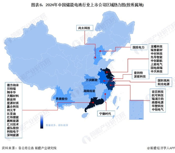 我国储能电池行业产业链参与方多,产业链建设已较完整,上市公司数量较多。其中,中游储能电池制造上市公司包括宁德时代、比亚迪、瑞浦兰钧、亿纬锂能、国轩高科、鹏辉能源、南都电源、中创新航、普利特和派能科技等。从产业链上市公司分布来看,广东、江苏和浙江上市公司分布最多。