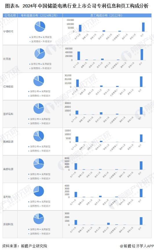 从储能电池行业的上市企业已有的公开信息分析,专利信息相对较多的企业是比亚迪,专利总数为27041条;员工总数最多的也是比亚迪,员工总数为570060人。