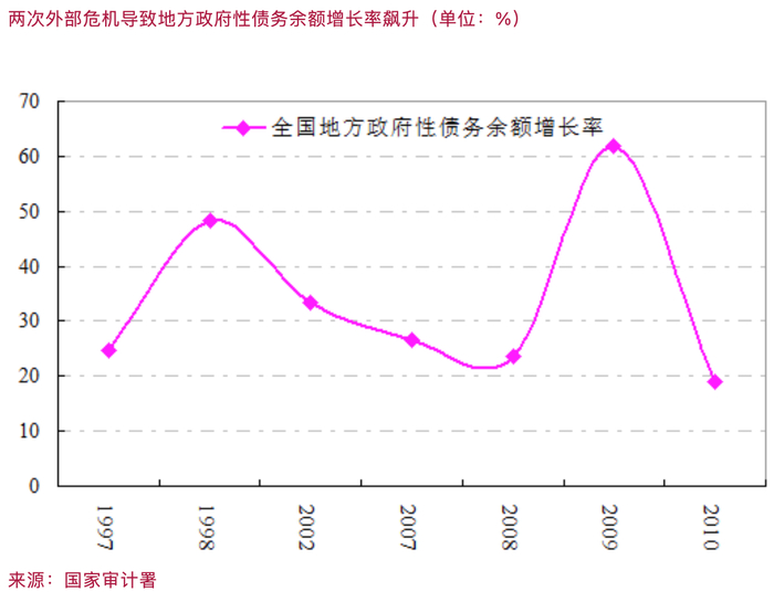 2011年,我对于地方债务的过快增长感到担忧,写了一篇文章《昨日推力会否变成明日陷阱》,发现为了应对1997年亚洲金融危机和2008年次贷危机的冲击,都采取了地方政府投资大扩张的方式,并为此大规模向银行举债,前一次地方政府性债务增速达到48%的峰值,后一次达到62%的峰值。