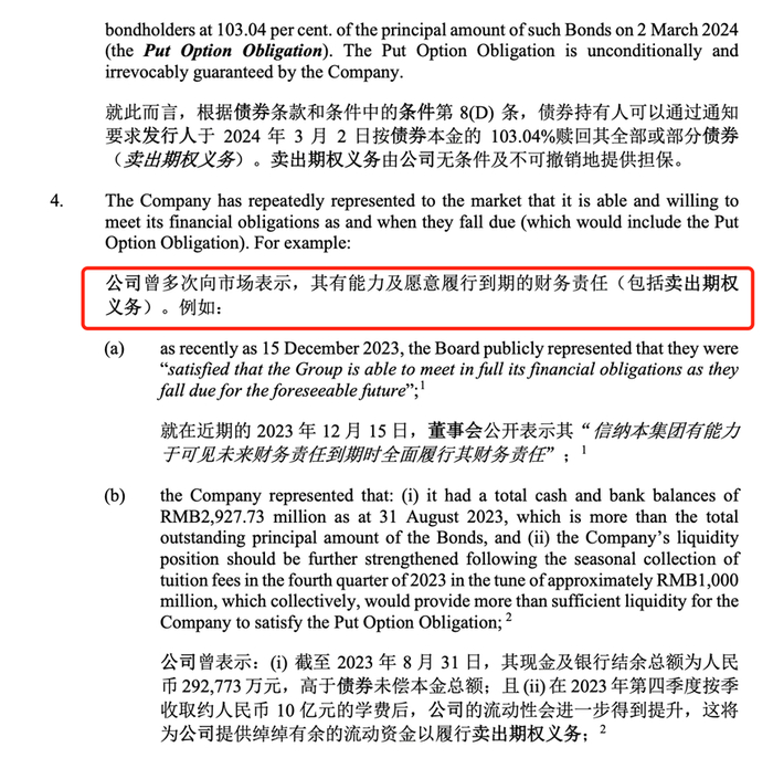 在去年11月30日披露的2023年年报(截至2023年8月31日)中,希望教育也称,已取得足够授信用于偿还到期债券。