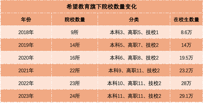 近两年,希望教育扩张步伐明显放缓。但随着校区的新建、改扩建,公司旗下院校的招生数量、公司收入都还在增长。