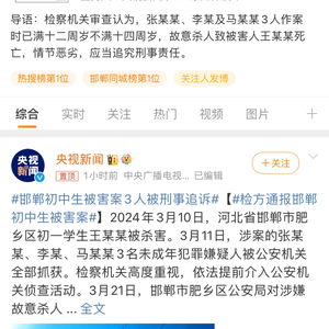据悉,2024年3月10日,河北省邯郸市肥乡区初一学生王某某被杀害。3月11日,涉案的张某某、李某、马某某3名未成年犯罪嫌疑人被公安机关全部抓获。