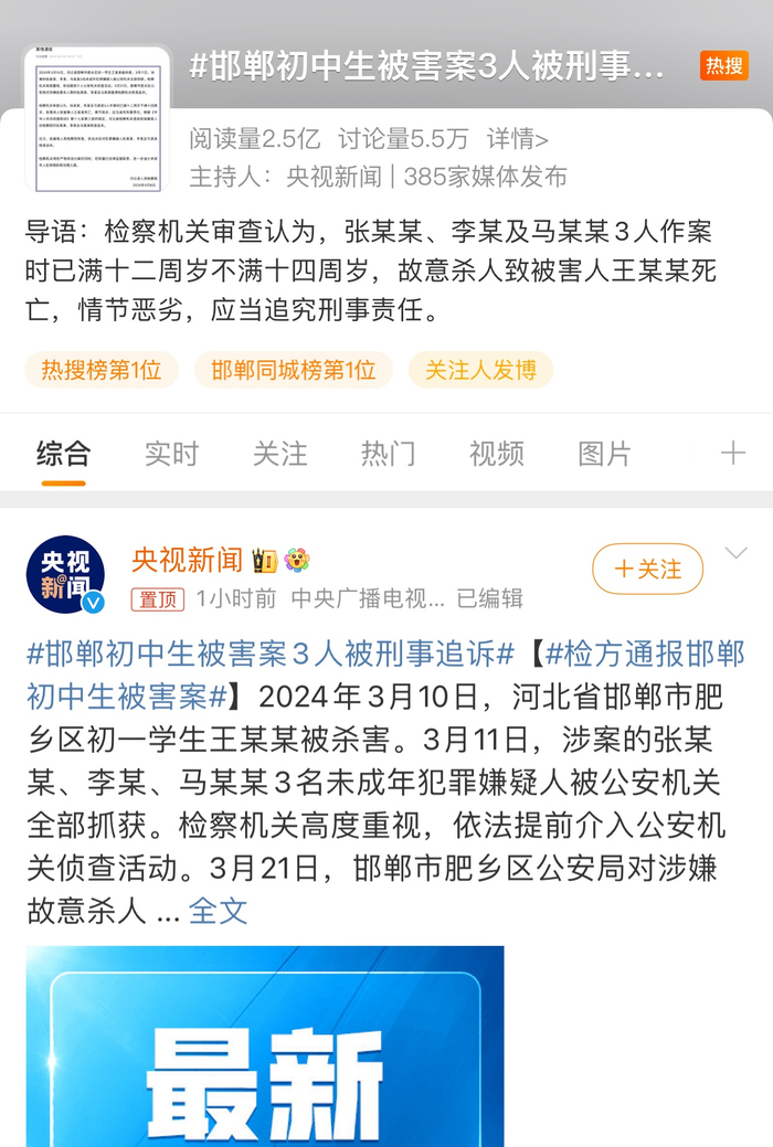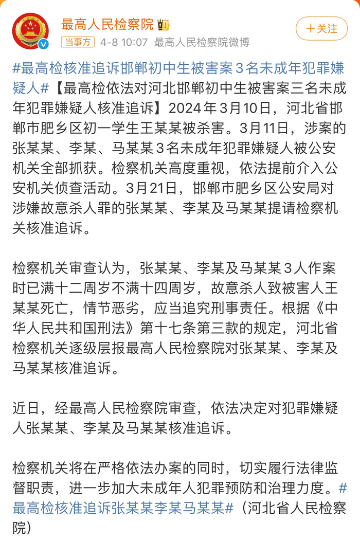 今日,最高检发布:依法对河北邯郸初中生被害案三名未成年犯罪嫌疑人核准追诉。该消息受到极大关注。