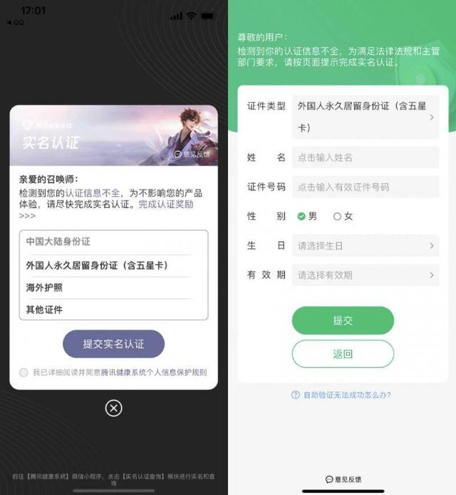 目前,腾讯游戏旗下健康系统为中华人民共和国居民身份证、港澳居民来往内地通行证、台湾居民来往大陆通行证、华侨护照、外国人永久居留身份证(含五星卡)、海外护照等证件提供实名服务,且无论何种证件实名为未成年人,都将受到防沉迷系统限制。