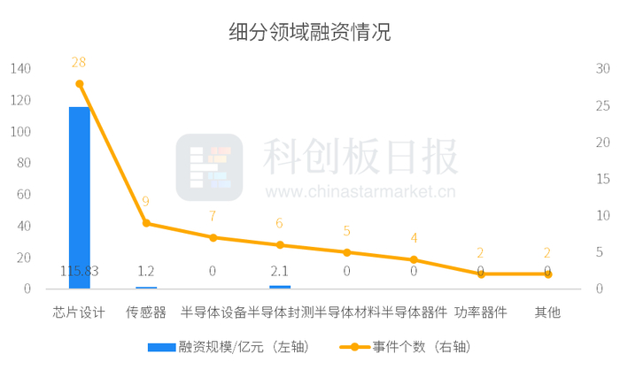 从细分领域来看,3月芯片设计领域最活跃,共发生28起融资,披露的融资总额也最高,约为115.83亿元。存储芯片公司长鑫科技获兆易创新、长鑫集成、合肥产投、建信金融资产投资等多家机构共同参与的108亿元股权融资,为3月半导体领域披露金额较高的融资事件。