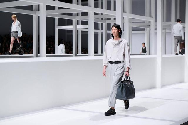 在雅致的色系下,本季爱马仕男装从版型上令身体超脱束缚,让人自信驾驭短裤、夹克与短身风衣。亲肤面料、双面穿皮革的运用则令多元的视角效果更立体。模特在T台上的不同搭配也呈现了巧妙叠搭的效果。可以说,放慢脚步、享受生活的理念在这一季中获得体现。