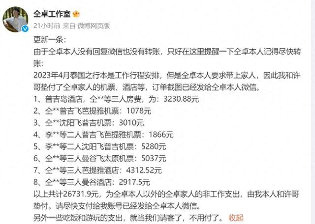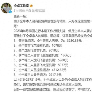 近日,仝卓和其工作室的纠纷冲上热搜。仝卓工作室连续发文进行微博讨账,称2023年仝卓家人去泰国花费26731.9元为非工作支出,需要归还;还称仝卓在2021年度汇算清缴时应补缴税款87185.96元,连滞纳金共10万元左右,由工作室垫付,也要尽快归还。有网友表示,“真的很幽默,第一次见工作室下场讨债”“工作室公开向艺人讨债,这放在娱乐圈真的是很炸裂的事情了”。