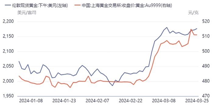 如下图这是用iFinD制作截至今年3月25日的黄金价格走势图,我们可以看出国际和国内黄金金价均有明显走高。