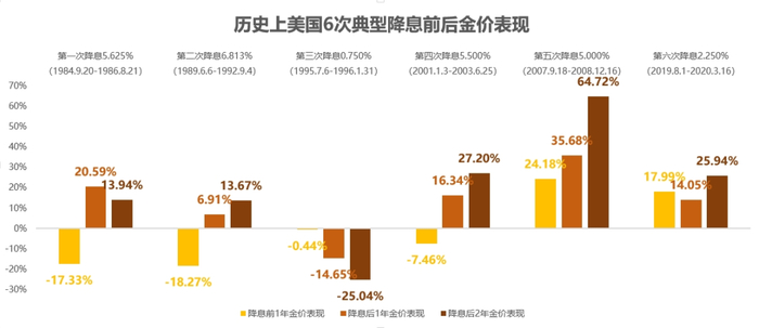 美元:美国目前的高通胀和可见未来的预期降息已经成为资本市场共识,而从历史上美联储六次典型降息来看(下图),金价在降息周期也有不俗表现。