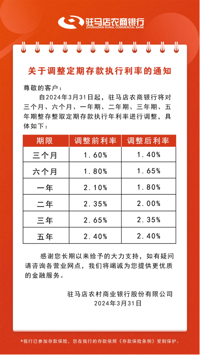 具体而言,自2024年3月31日起,驻马店农商银行将对三个月、六个月、一年期、二年期、三年期、五年期整存整取定期存款执行年利率进行调整。