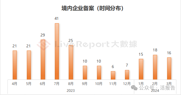 从时间维度上看,备案在去年三季度迎来了一波“小高潮”,7月备案企业达到峰值,41家。今年一季度,相较去年四季度,备案数量整体有所提升,平均每月在16家左右。