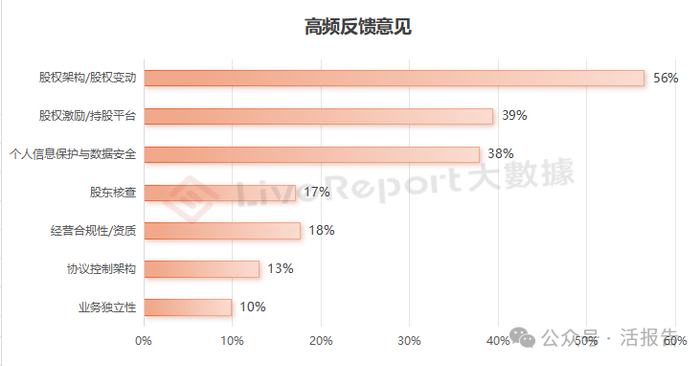 从反馈内容看,具体反馈问题及出现次数如下:股权架构/股权变动(109)、股权激励(76)、个人信息保护与数据安全(73)、经营合规性与资质(34)、股东核查(33)、业务独立性/关联交易(19) 等。