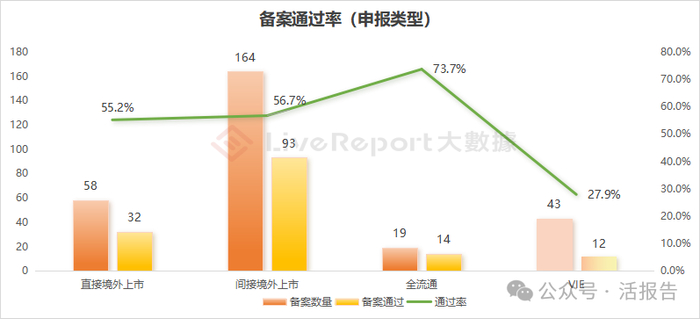 具体来看,申报类型层面,仅申请全流通的企业备案通过率最高,达到73.7%;申请直接境外上市和间接境外上市的备案通过率相差无几,分别为55.2%和56.7%。