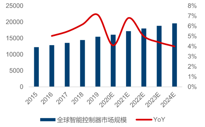 全球智能控制器市场仍在上行。随着科技进步和社会消费升级,消费者对各式终端设备产品在智能化、节能化等方面诉求不断提升,智能电控产品的下游应用领域不断丰富,在智能家居、商用电器、电动工具、汽车电子、工业自动化、医疗电子等下游行业得到快速推广。在万物互联的快速发展下,智能控制器产业不断升级,行业智能化、场景化发展机遇涌现,下游应用场景更是不断丰富、终端功能不断进行智能化升级,因此,控制器部署需求增加、产品附加值不断提升,在量价齐升双重推动下,智能控制器行业规模将持续成长。根据Frost&Sullivan的预测,到2024年全球智能控制器市场规模有望达到约2万亿美元,国内智能控制器市场将达到3.8万亿元,市场的边界将持续扩大。在全球产业向中国转移和专业化分工的持续发展过程中,国内专业电子制造企业展现了其产业集群优势,其中专业的智能控制器制造企业在全球影响力也在不断深化。