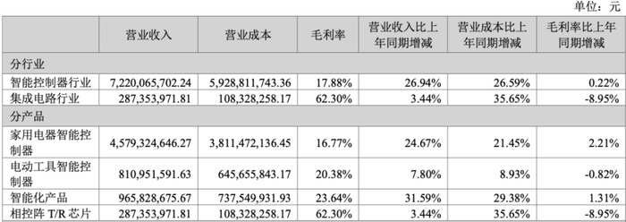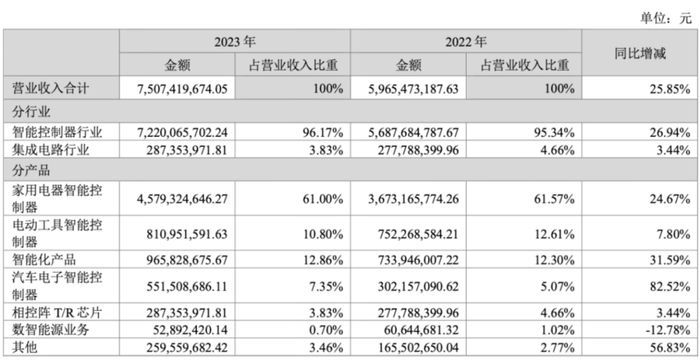 2023年度,在全球形势错综复杂,世界经济复苏缓慢,国内经济曲折前进,多重困难挑战交织叠加的大环境下,公司依然凭借强劲的综合实力和优秀的产品,加大客户开拓力度、提高产品覆盖面,实现客户订单交付增加及新客户、新项目订单增加。其中家用电器智能控制器方面,公司海外大客户新项目订单开拓进展顺利并持续突破新客户,市场份额呈现快速增长的态势;同时,创新产品不断涌现,洗碗机、蒸烤箱、空气炸锅、烘洗一体机等控制产品已与多个全球知名终端厂商形成业务合作,整体进展顺利,使得该业务营收同比增长24.67%至45.79亿元。电动工具业务方面,公司凭借在国际客户中的服务影响力及技术竞争力进入了TTI、博世、HILTI、百得、喜利得、泉峰和大叶等海内外多个头部客户的供应体系,市场份额稳步提升,营收同比提升7.8%至8.11亿元。智能化产品业务则得益于研发的智能床垫、智能书包等产品以及智慧体育平台已实现批量生产与交付,与慕思、恒林家居、顾家家居多个行业优质客户形成业务,板块实现销售收入9.66亿元,同比增长31.59%。