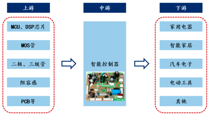 智能控制器是大小家电、工具、汽车、智慧家居、AI设备、工业设备装置、智能建筑等各领域终端产品的核心控制部件,是独立完成某一类特定功能的计算机单元,在各类终端电子整机产品中扮演“心脏”与“大脑”的角色。当前广泛应用于汽车电子、生活家电、电动工具、AI设备、储能设备以及工业设备等领域,下游应用空间广阔。