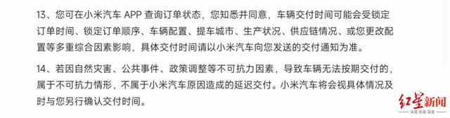 在小米汽车App内的《小米汽车购车协议》中,红星新闻记者看到,“交付”下的第13条提及,“您知悉并同意,车辆交付时间可能会受锁定订单时间、锁定订单顺序、车辆配置、提车城市、生产状况、供应链情况、或您更改配置等多重综合因素影响,具体交付时间请以小米汽车向您发送的交付通知为准。”