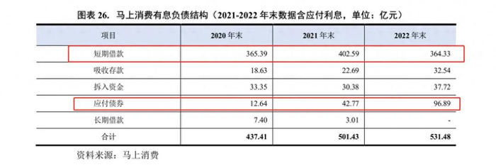 2020年、2021年、2022年,马上消费短期借款分别为365.39亿元、402.59亿元、364.33亿元;同期,吸收存款18.63亿元、22.69亿元、32.54亿元,该部分存款主要为股东的存款。虽然短期借款规模增加量不大,但是公司应付债券的数量上升迅速,2020年、2021年、2022年,公司应付债券余额分别为12.64亿元、42.77亿元、96.89亿元。
