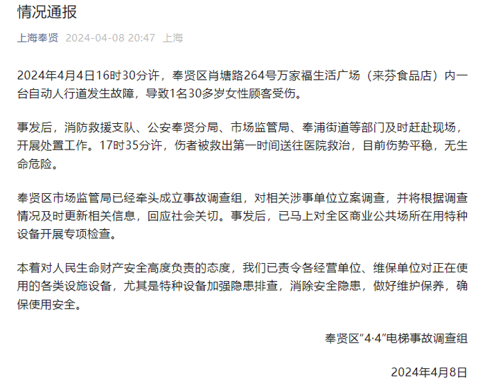 据上海奉贤官微消息,2024年4月4日16时30分许,奉贤区肖塘路264号万家福生活广场(来芬食品店)内一台自动人行道发生故障,导致1名30多岁女性顾客受伤。