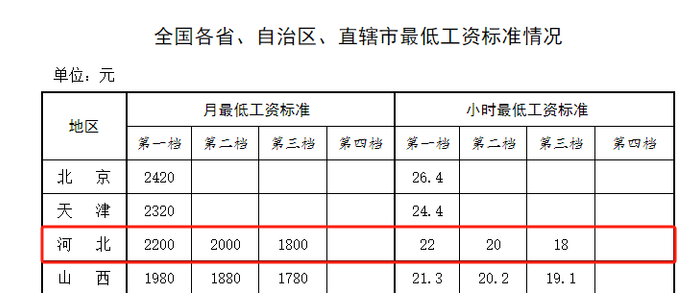 其中,河北省第一档月最低工资标准为2200元,第一档小时最低工资标准为22元。第二档和第三档分别为2000元、1800元。