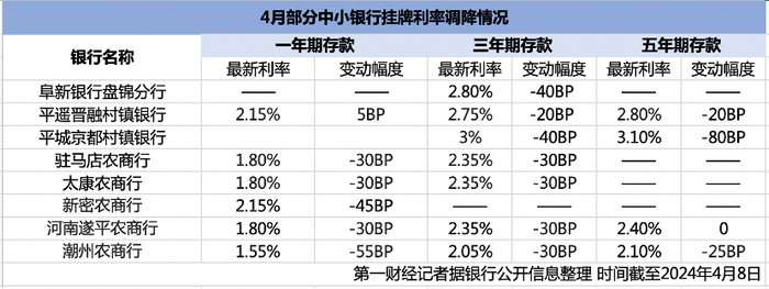 据记者不完全统计,截至4月8日,广东、河南多地的十余城农商行、村镇银行密集宣布下调存款利率,调降重点多集中在中长期限存款,下调区间在25BP~80BP左右。