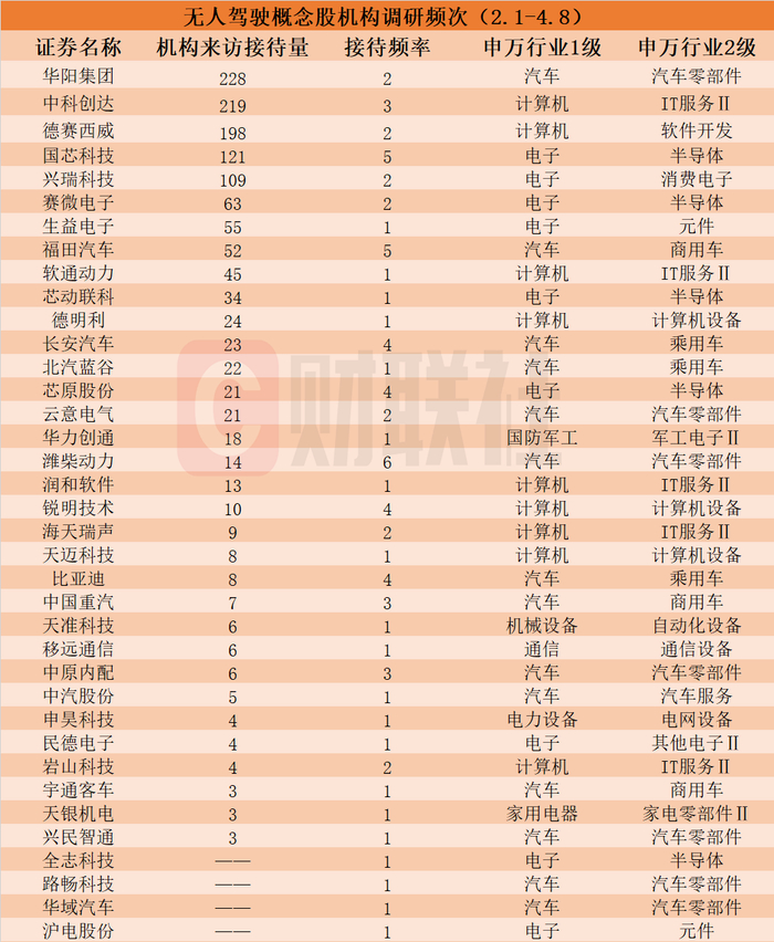 据Choice数据显示,在2月1日-4月8日期间获机构调研的包括华阳集团、中科创达、德赛西威、国芯科技、兴瑞科技、赛微电子、生益电子、福田汽车、软通动力、芯动联科、德明利、长安汽车、北汽蓝谷、芯原股份、云意电气、华力创通、潍柴动力、润和软件、锐明技术、海天瑞声、天迈科技、比亚迪、中国重汽、天准科技、移远通信、中原内配、中汽股份、申昊科技、民德电子、岩山科技、宇通客车、天银机电、兴民智通、全志科技、路畅科技、华域汽车和沪电股份,具体情况如下:
