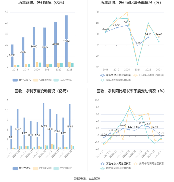 2023年,公司毛利率为36.61%,同比上升0.16个百分点;净利率为9.45%,较上年同期上升0.08个百分点。从单季度指标来看,2023年第四季度公司毛利率为31.83%,同比下降5.86个百分点,环比下降8.99个百分点;净利率为9.31%,较上年同期下降0.97个百分点,较上一季度上升1.24个百分点