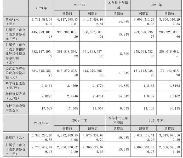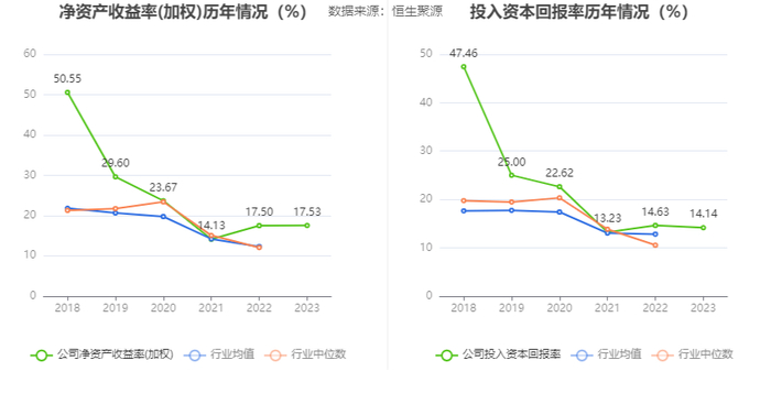 数据显示,2023年公司加权平均净资产收益率为17.53%,较上年同期增长0.03个百分点;公司2023年投入资本回报率为14.14%,较上年同期下降0.49个百分点。