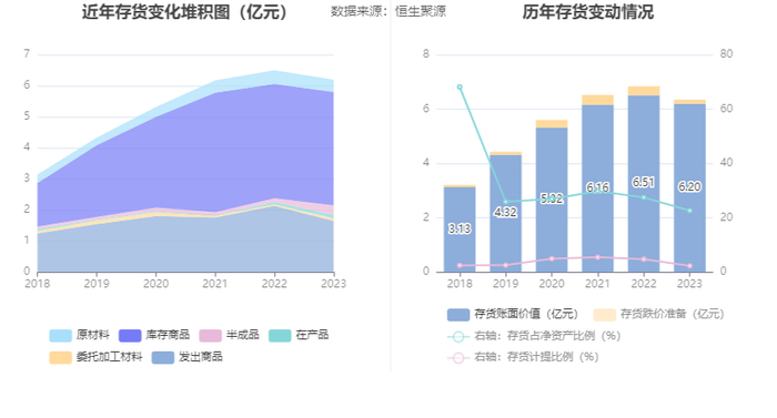 从存货变动来看,截至2023年年末,公司存货账面价值为6.2亿元,占净资产的22.65%,较上年末减少3111.33万元。其中,存货跌价准备为1473.38万元,计提比例为2.32%。