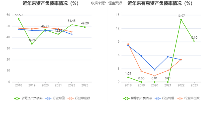 在偿债能力方面,公司2023年年末资产负债率为49.20%,相比上年末下降2.25个百分点;有息资产负债率为9.10%,相比上年末下降4.87个百分点。