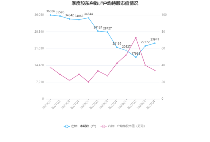 筹码集中度方面,截至2023年年末,公司股东总户数为2.39万户,较三季度末增长了1169户,增幅5.13%;户均持股市值由三季度末的40.01万元下降至34.03万元,降幅为14.95%。