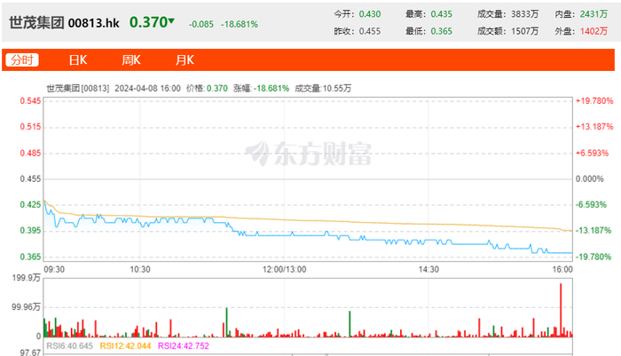 截至4月8日收盘,世茂集团当天的股价跌去了18.68%,收于0.37港元/股;其间接控股的世茂股份(ST世茂)也跌去了4.55%,收于1.05元/股。
