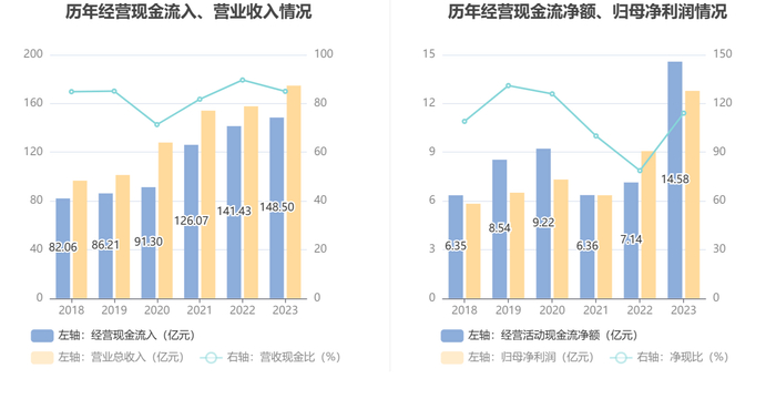 2023年,公司经营活动现金流净额为14.58亿元,同比增长104.27%;筹资活动现金流净额-1.46亿元,同比减少25.83亿元;投资活动现金流净额-18.20亿元,上年同期为-12.74亿元。