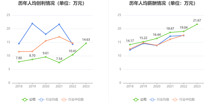 截至2023年末,公司员工总数为8734人,人均创收200.03万元,人均创利14.63万元,人均薪酬21.67万元,较上年同期分别增长10.53%、40.60%、13.81%。