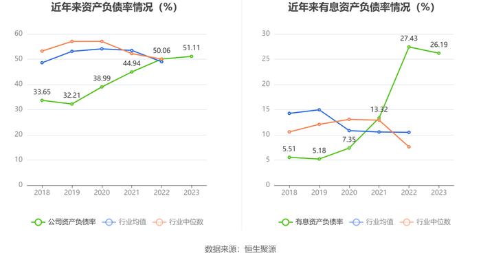 在偿债能力方面,公司2023年年末资产负债率为51.11%,相比上年末上升1.05个百分点;有息资产负债率为26.19%,相比上年末下降1.24个百分点。