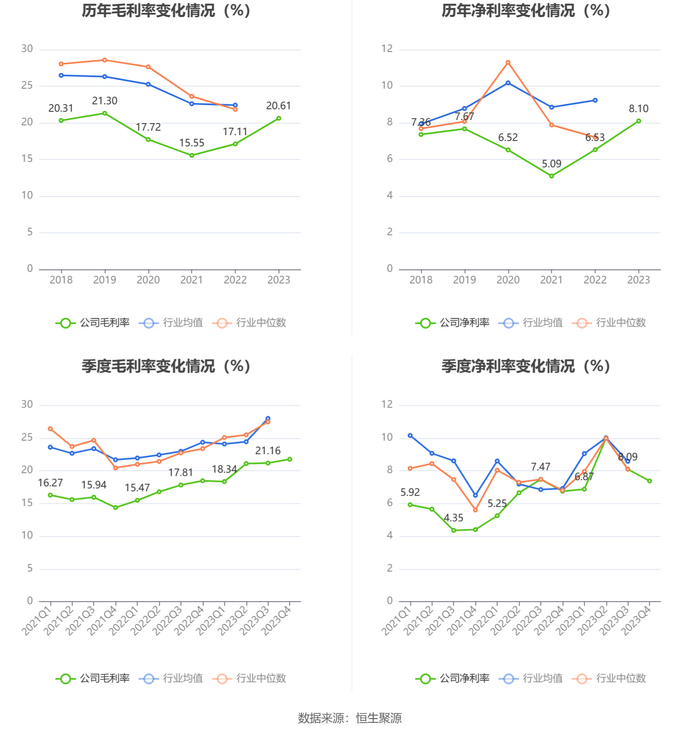 2023年,公司毛利率为20.61%,同比上升3.50个百分点;净利率为8.10%,较上年同期上升1.57个百分点。从单季度指标来看,2023年第四季度公司毛利率为21.74%,同比上升3.28个百分点,环比上升0.58个百分点;净利率为7.37%,较上年同期上升0.63个百分点,较上一季度下降0.72个百分点。